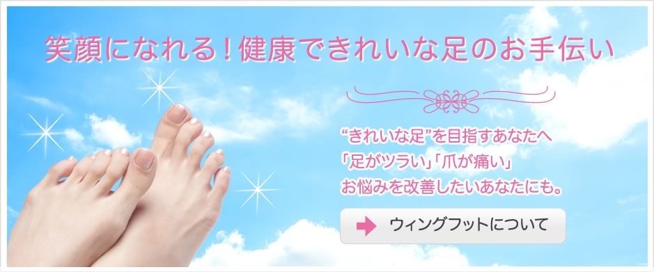Wingfoot(ウィング・フット)では、痛くない、足にやさしいフットケアをおこなっています。「早く相談すればよかった」「歩くのが楽になった」「オシャレが楽しめる」「旅行やスポーツが出来る」「足のエステみたい」など、嬉しい声を頂いております。